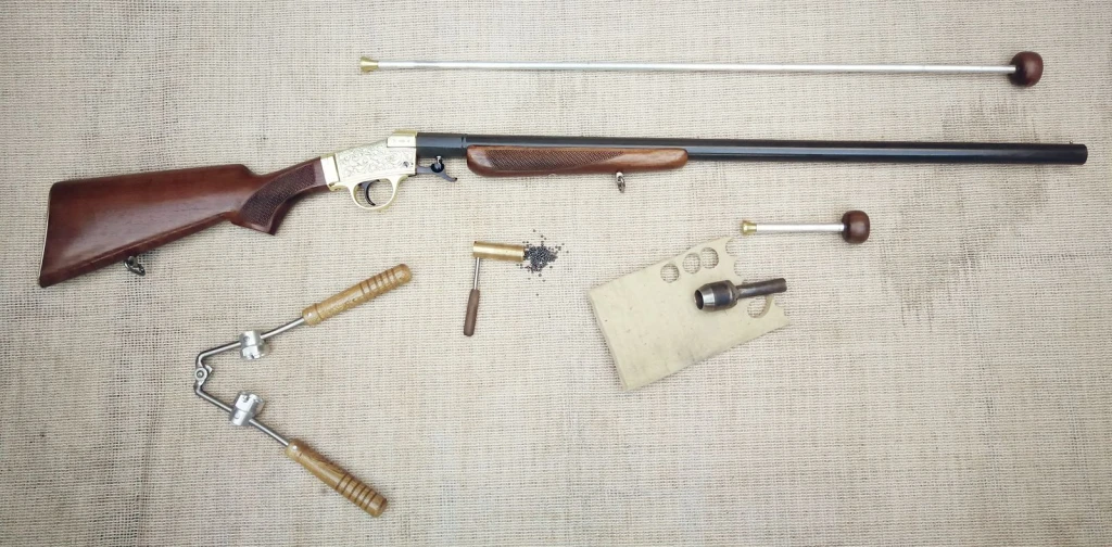 Se trata de una de nuestras últimas creaciones. Es una escopeta con sistema de percusión Underhammer (martillo abajo), en calibre 19.5mm de AVANCARGA, equivalente a 10 Gauge. La culata y chimaza son de Nogal pulido al aceite con segrinado a mano. El bloque es de Latón y está finamente grabado a mano. El cañón mide 75 cm de largo y está empavonado al aceite. La cantonera está segrinada y es de Latón. Puede utilizarse con perdigones como con bola (monoposta), calibre 18, 5mm.