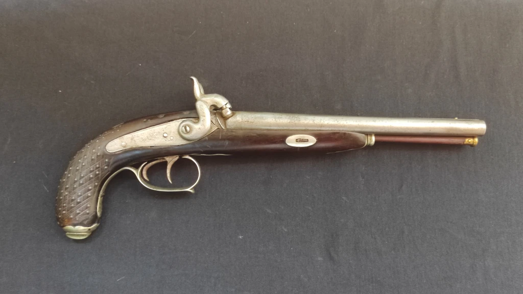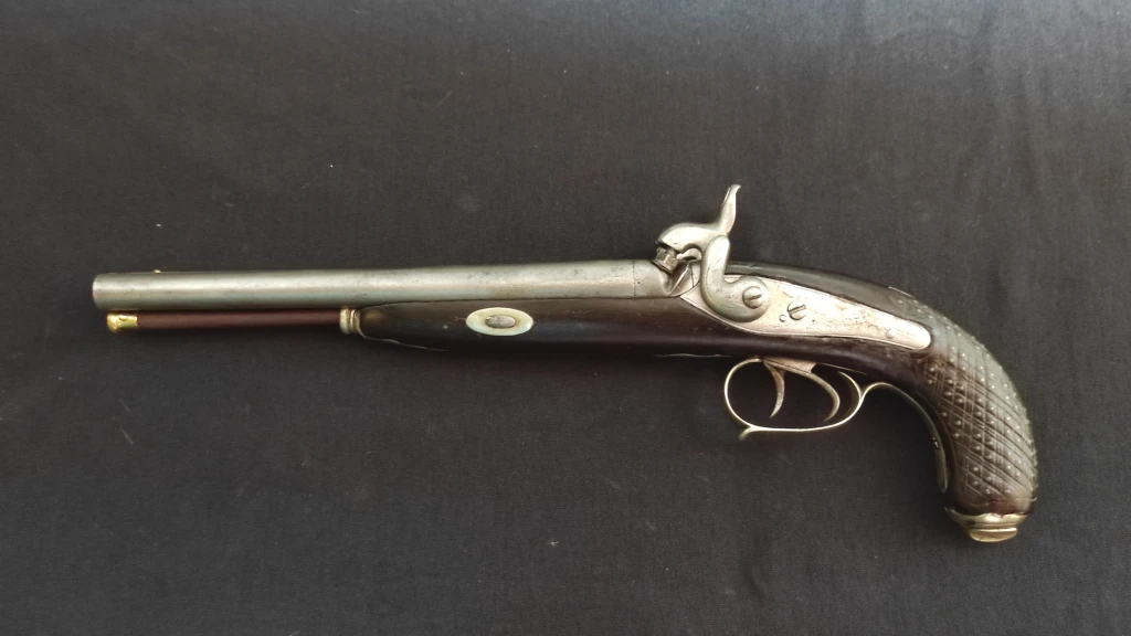 Posee guarniciones de alpaca labradas y un hermoso porta fulminantes en el remate de la culata, la cual a su vez, se encuentra toda claveteada en Alpaca... nos remonta a mediados del siglo XIX