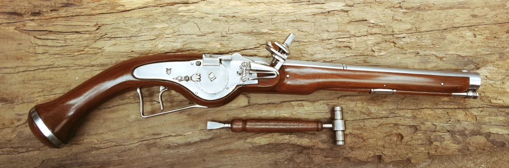Réplica fiel de una pistola de rueda alemana del año 1632 utilizada en la famosa guerra de los 30 años.Funciona con pirita de hierro para generar la chispa como la original y está dotada de su llave para montar el mecanismo, girando la rueda se tensa un muelle plano en forma de "V" transmitiéndose el movimiento por medio de una cadeneta de eslabones de acero.