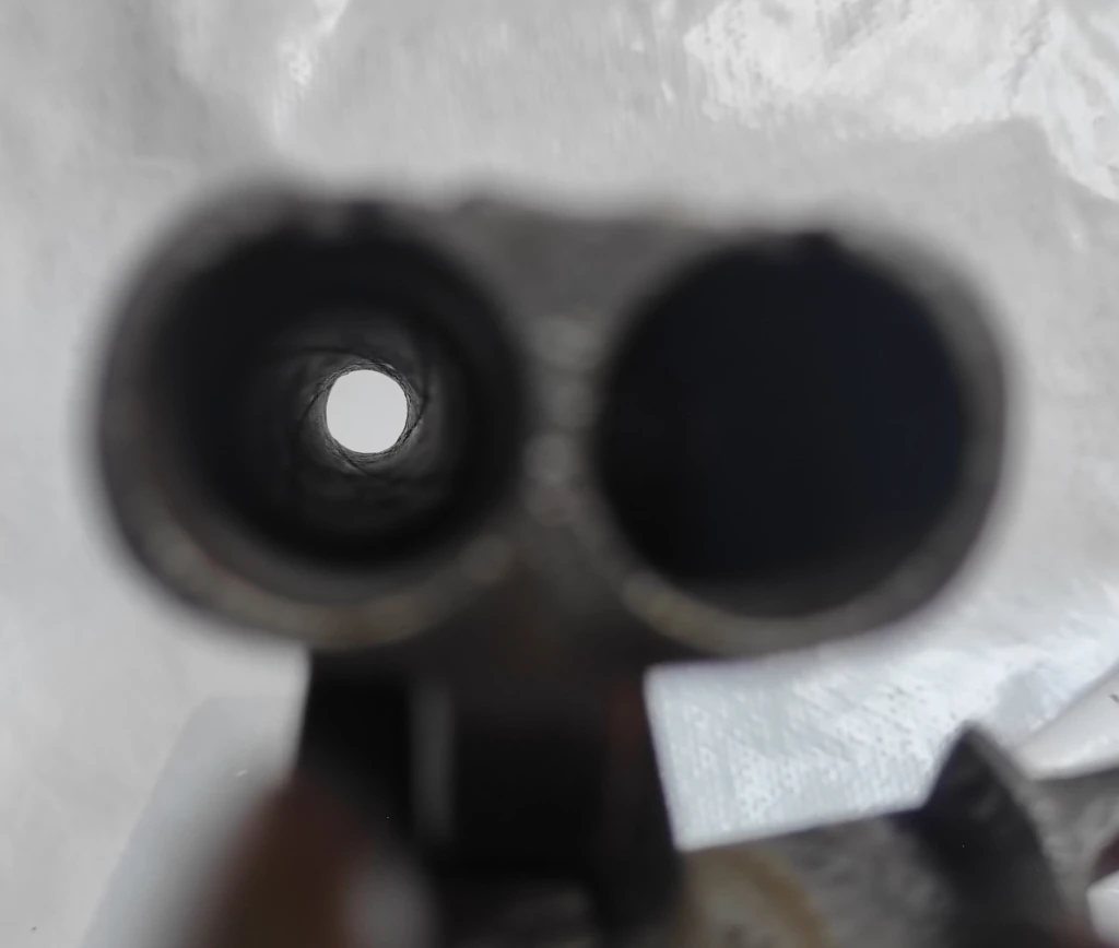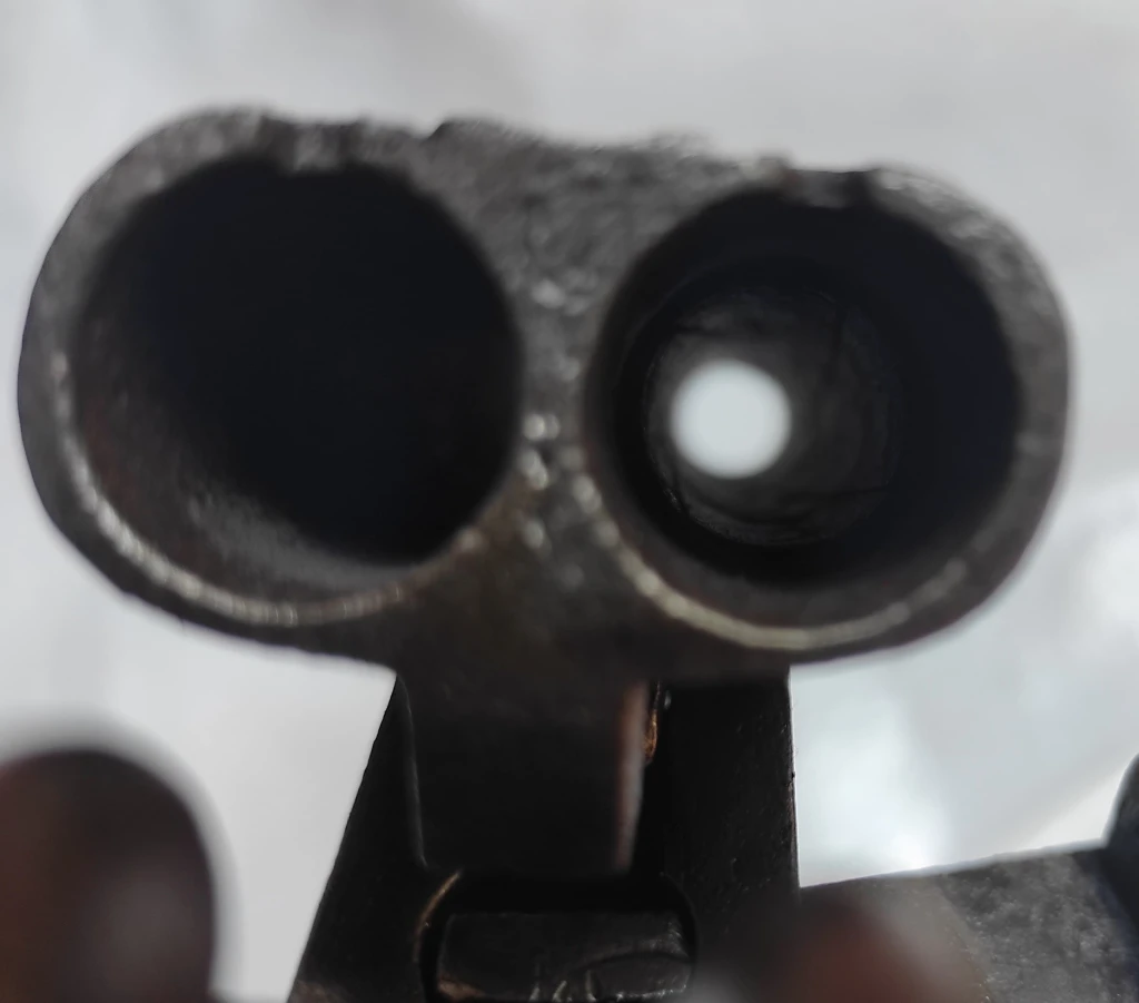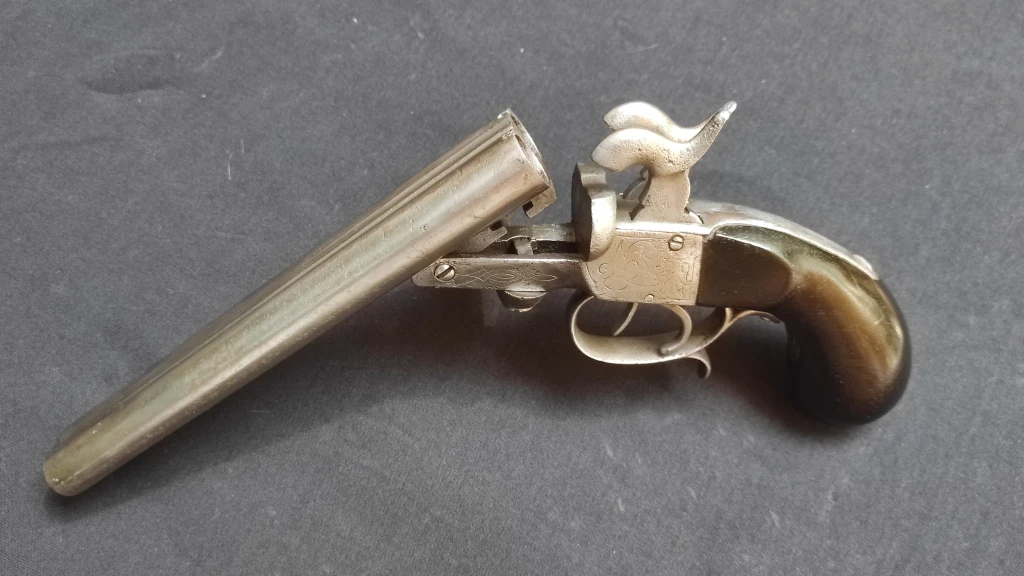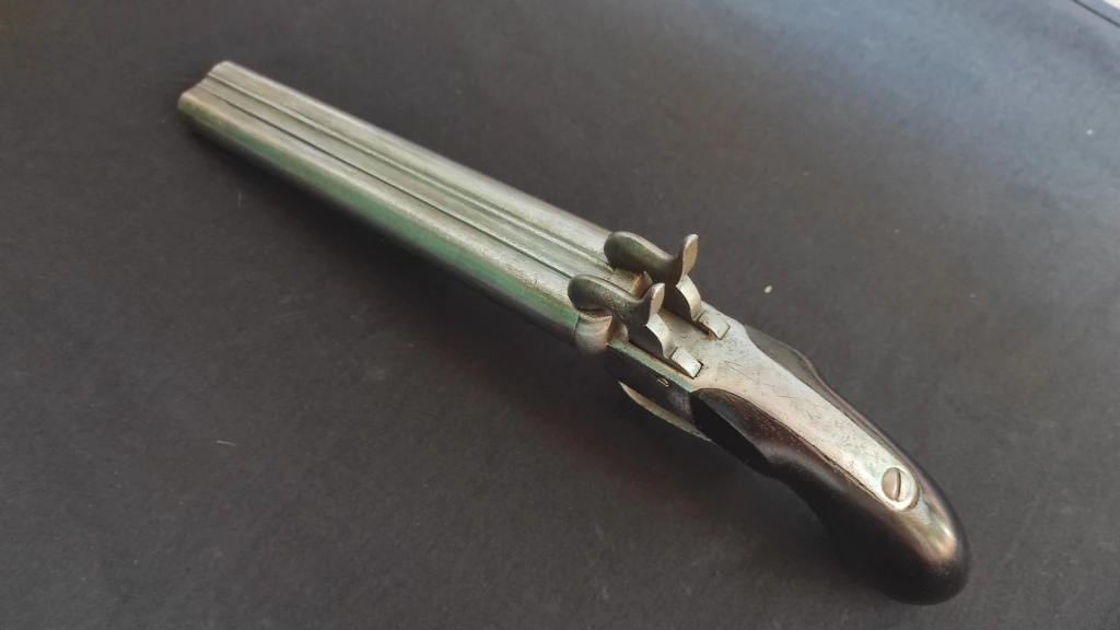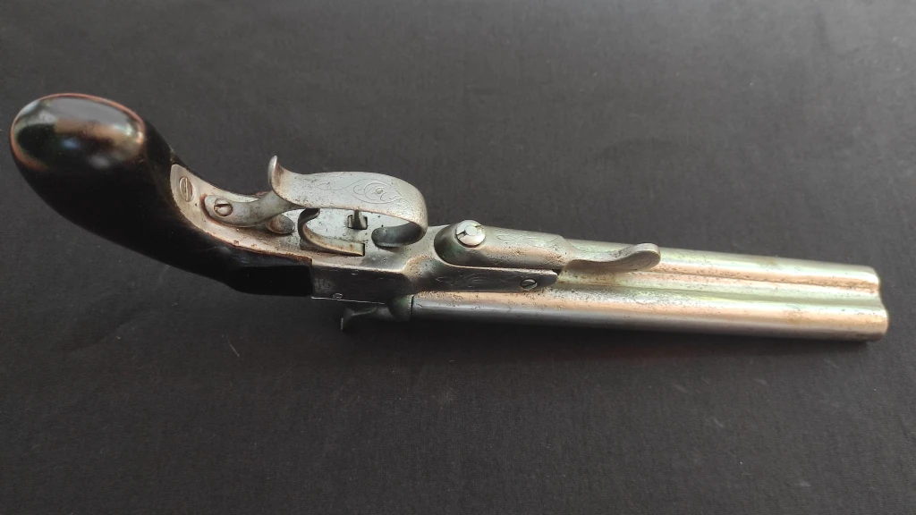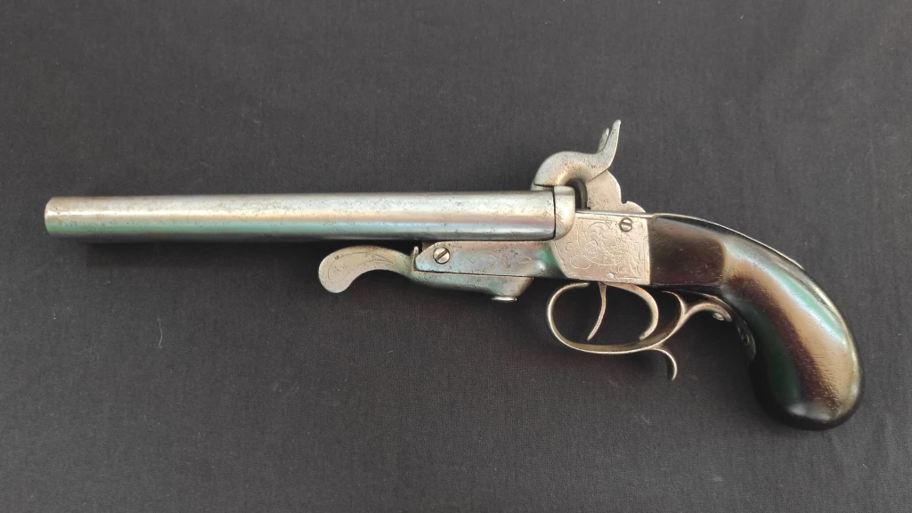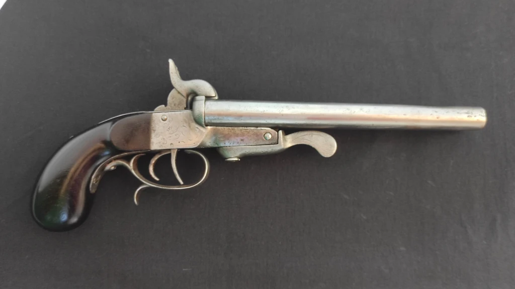 Pistola de dos caños de origen belga de Gran calibre.. 15 mm sistema de espiga con quiebre de apertura primitivo.. doble cola de disparador y seguro de traba de caños de los primeros modelos construidos