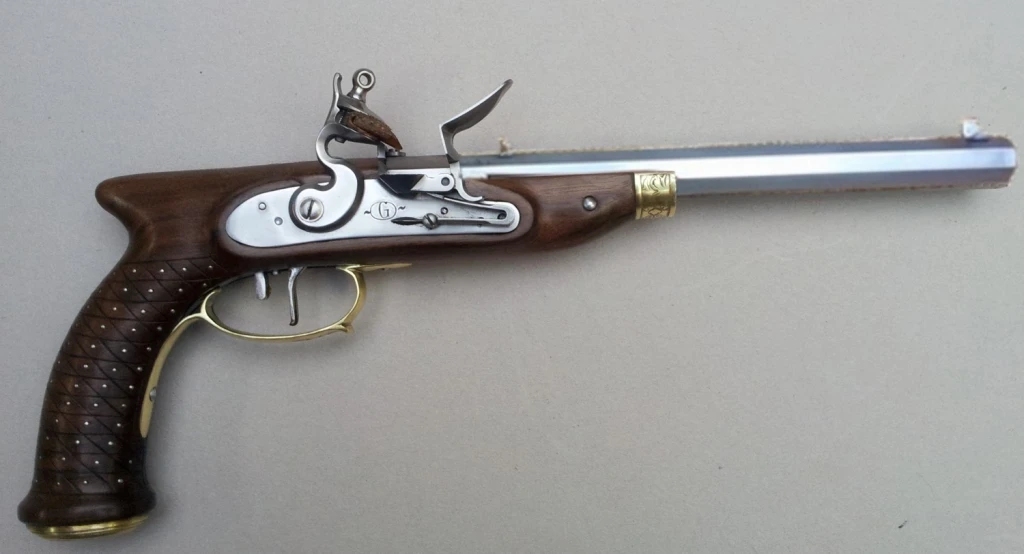 Réplica de la pistola inglesa estilo " mango de sierra", construida por el célebre armero John Perkins a comienzos del siglo XIX. Esta pistola se destaca por su corte ergodinámico, lo que facilita su empuñe, teniendo miras regulables. Posee una hermosa boquilla trabajada debajo del cañón en la parte delantera y una hermosa roseta de remate en la culata. Tiene arco guardamonte con apoya dedo para facilitar el balance del arma. Es singular en esta pistola el cuadriculado que presenta la culata. Como toda pistola apta para el tiro, posee disparador de pelo.